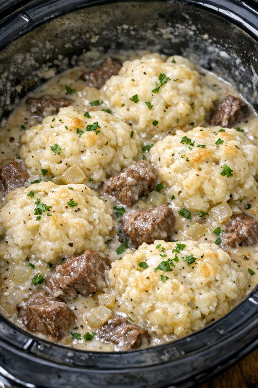 Cover the slow cooker with the lid. Cook on LOW for 7 to 8 hours, or on HIGH for 3 1/2 to 4 hours, until the beef is very tender and the biscuit dumplings are puffed, set in the center, and no longer doughy when you break one open.