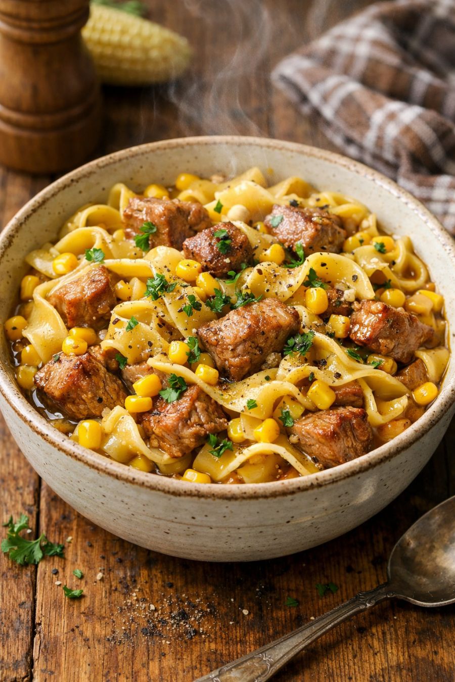 I like to ladle these creamy pork and corn noodles into wide, shallow bowls so the broth can soak into the noodles. A simple side of buttered green beans or peas, or even just sliced tomatoes with a sprinkle of salt, keeps with that old-fashioned farmhouse feel. Warm dinner rolls or thick slices of buttered bread are perfect for sopping up the sauce. If you want to round it out further, serve with a crisp lettuce salad dressed lightly with vinegar and oil to balance the richness of the noodles.