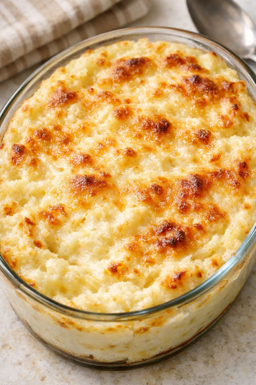 Remove from the oven and let the dish rest for about 5–10 minutes. The potatoes will set slightly, making them easier to scoop while still staying fluffy inside. Serve straight from the glass dish while hot, showcasing the golden, cheesy crust.