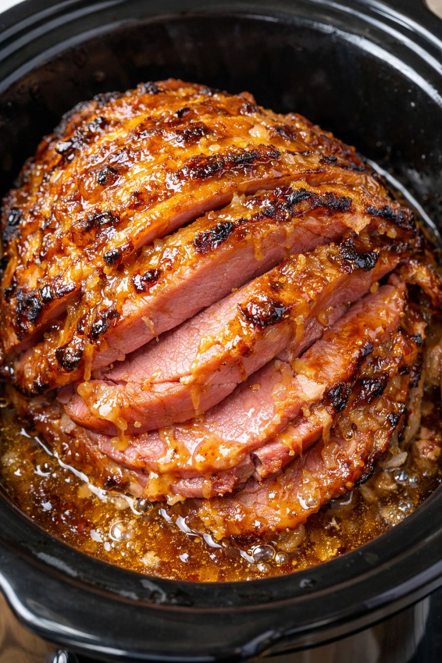 Cover the slow cooker with the lid. Cook on LOW for 4–6 hours, or until the ham is heated through, very tender, and the edges of the slices look caramelized and deep golden where the glaze has bubbled.