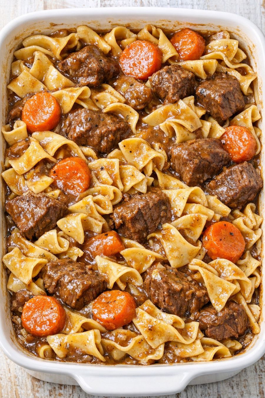 Let the dish rest for 5–10 minutes before serving so the gravy can settle and cling to the noodles. Serve warm, scooping down to the bottom so each serving gets a good mix of beef, carrots, and pasta.