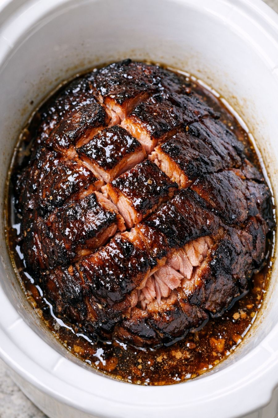 Pour the thickened glaze back over the ham in the slow cooker, using a spoon or brush to spread it into all the creases. Cover and cook on LOW for another 15–20 minutes so the glaze sets and turns shiny and sticky. The edges of the ham should look deeply caramelized, with amber juices pooling at the bottom.