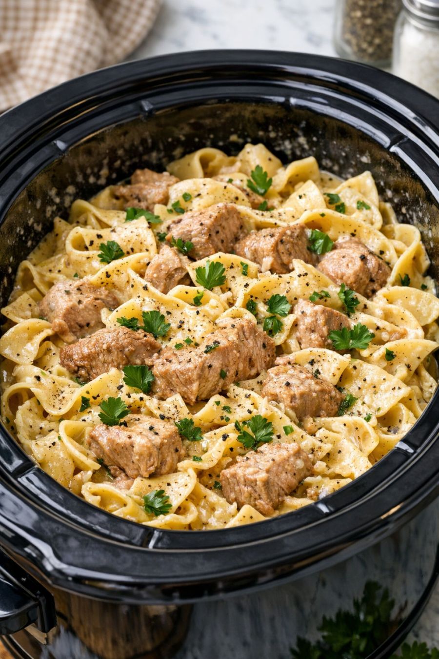 If you prefer a creamier dish, stir in 1/4 to 1/2 cup of milk or half-and-half at the end of cooking to loosen the noodles and make the sauce silkier. For a slightly lighter flavor, use unsalted butter and season with salt and pepper at the table. You can swap cream of mushroom soup for cream of chicken or cream of celery, depending on what you have in the pantry. If your slow cooker tends to run dry, add 1/2 cup of water or chicken broth around the pork and noodles at the beginning so there’s plenty of moisture for the noodles to absorb. For a bit of color, stir in a cup of thawed peas or mixed vegetables during the last 20 to 30 minutes of cooking. This recipe also works nicely with pork loin of a similar size; just keep an eye on the cooking time so it doesn’t dry out. Leftovers reheat well on the stovetop with a splash of water or broth to loosen the sauce.