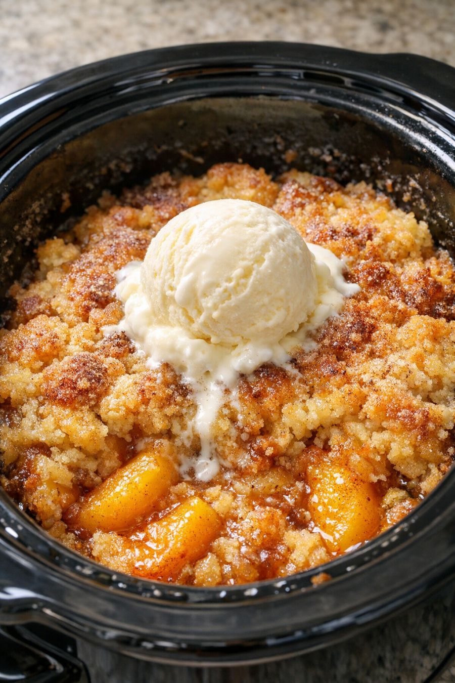 Serve this warm Amish peach cobbler straight from the slow cooker with a scoop of vanilla ice cream or a dollop of whipped cream so it melts into all the peachy juices. It’s also lovely with a spoonful of vanilla yogurt for a not-too-sweet afternoon snack. If you’re serving a bigger family meal, pair it with simple comfort foods like roast chicken or a slow cooker pot roast, then bring the slow cooker right to the counter so everyone can scoop their own dessert. A cup of coffee or hot tea for the grown-ups and cold milk for the kids makes it feel like a cozy Sunday supper, even on a weeknight.