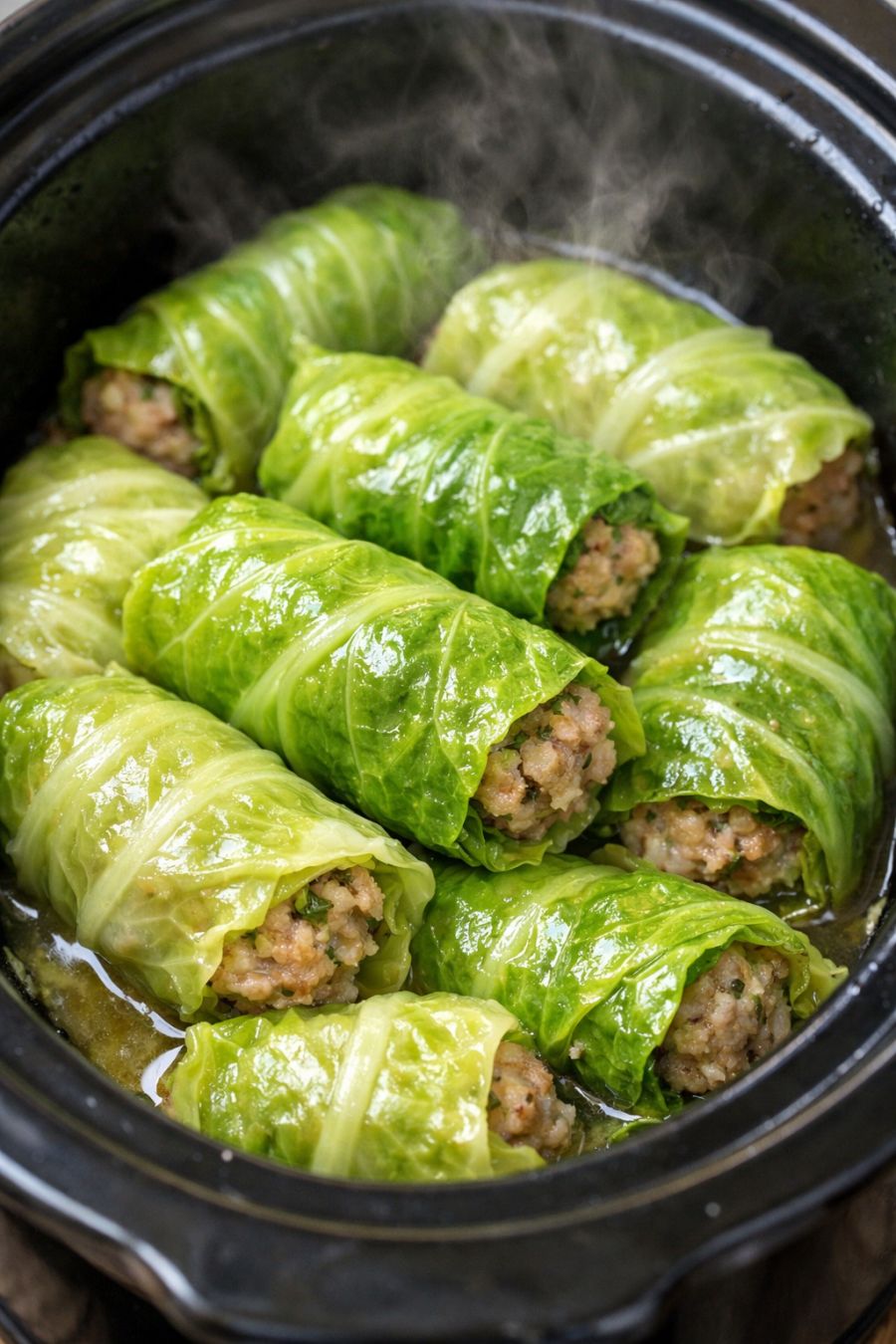 For a bit more depth without adding extra ingredients, you can lightly brown the ground pork in a skillet before mixing it with the onion soup mix; just let it cool slightly and keep it a bit underdone so it finishes cooking in the slow cooker. If your cabbage head is small and you have extra pork, form the remaining mixture into small meatballs and tuck them between the rolls so everything cooks together in the same broth. To lean things out, substitute half of the ground pork with lean ground turkey; the onion soup mix will keep the filling flavorful. For a slightly richer broth, use beef broth instead of chicken, or mix the two. If you prefer a softer, almost melt-in-your-mouth cabbage, extend the cooking time on LOW by about 30 minutes and keep the slow cooker covered. Leftovers reheat well in the broth on the stovetop over gentle heat, and the flavors deepen by the next day, making this an excellent make-ahead comfort dish.