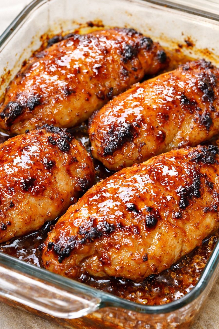 Pat the chicken breasts dry with paper towels and trim any excess fat. Arrange them in a single layer in the prepared glass casserole dish, leaving a little space between each piece so the glaze can flow around them.