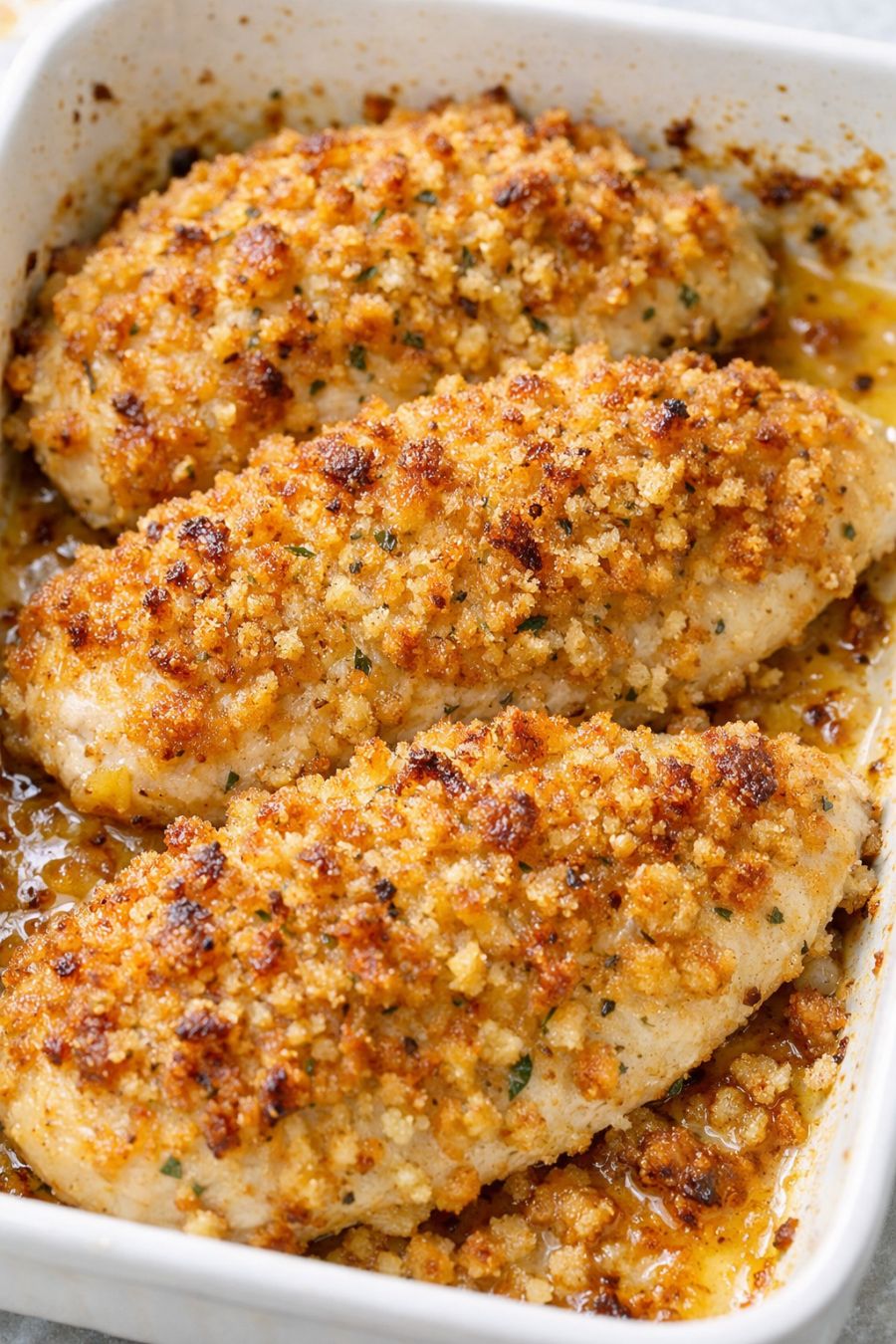 Serve this crispy butter crumb chicken straight from the white baking dish with something that can catch all the buttery crumbs: fluffy mashed potatoes, buttered egg noodles, or simple rice pilaf are all natural fits. A bright green vegetable—like steamed green beans, roasted broccoli, or a crisp salad with a tangy vinaigrette—helps balance the richness. If you want a more casual spread, pair it with coleslaw and crusty bread for scooping up the crunchy bits left in the pan.