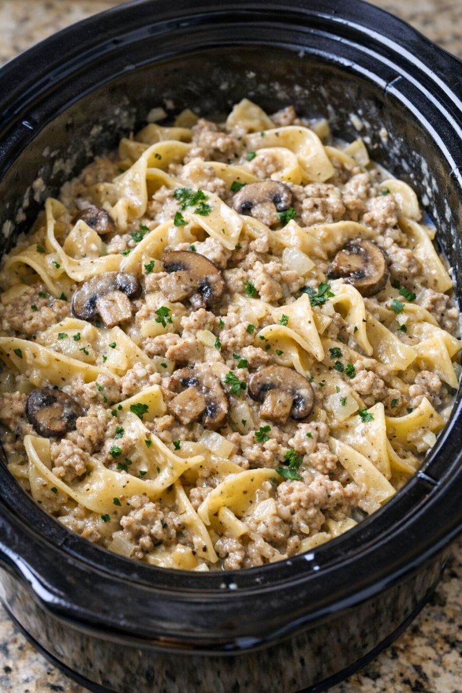 For a slightly richer flavor, you can replace 1/2 cup of the chicken broth with milk or half-and-half, stirring it in when you add the noodles so it doesn’t curdle. If your family loves mushrooms, add 1 to 2 cups of sliced fresh mushrooms on top of the turkey before spooning over the cream of mushroom soup. To sneak in extra veggies for picky eaters, stir in a cup of frozen peas or mixed vegetables during the last 10 minutes of cooking. If you prefer a stronger onion flavor, use an extra tablespoon of dry onion soup mix or add 1/2 cup of finely chopped onion with the turkey at the beginning. For a slightly lighter version, use 98% fat-free cream of mushroom soup and lean ground turkey, then thin the sauce with a bit more broth as needed. If you need to prep ahead, you can crumble the turkey into the slow cooker insert the night before, cover it, and refrigerate; in the morning, just spoon the soup over, add the remaining ingredients (except noodles), and start cooking. Leftovers reheat well on the stovetop with a splash of broth or water to bring the sauce back to a creamy consistency.