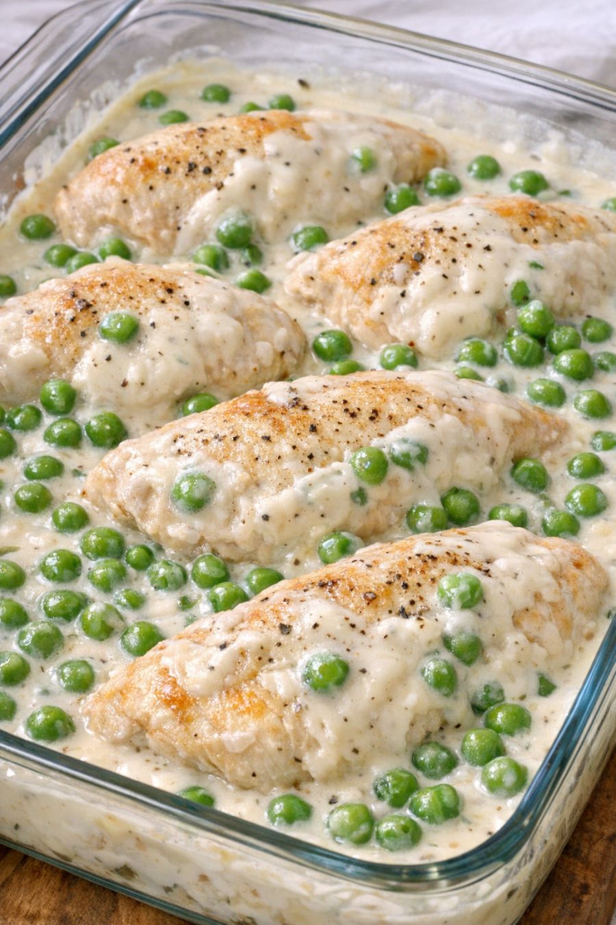 Once done, let the dish rest on the counter for about 5 minutes. The sauce will thicken slightly as it stands, giving you that rich, creamy blanket over the tender chicken and peas.