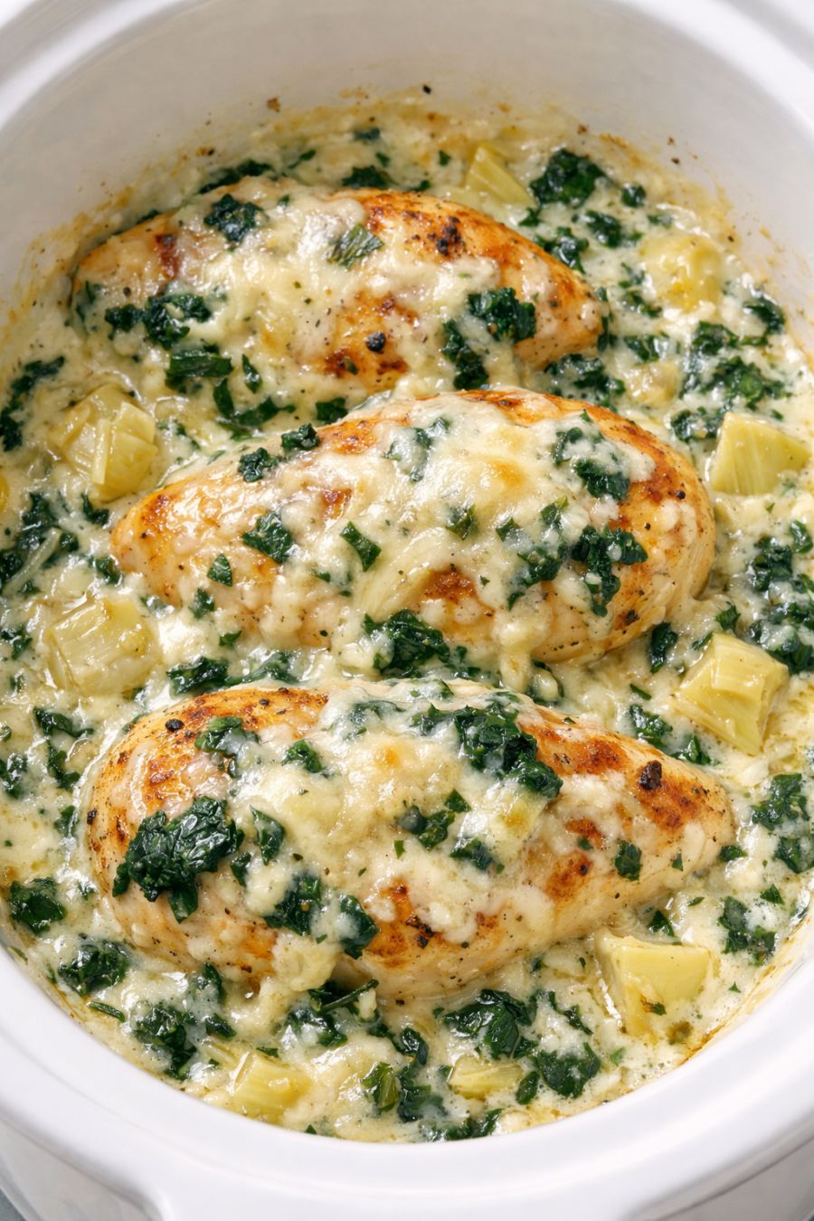 Every spring, my aunt brings this slow cooker spinach artichoke chicken to our family get-together, and it always disappears first. It tastes like creamy spinach artichoke dip wrapped around juicy chicken, but it’s secretly just four ingredients and a dump-and-go situation. On busy workdays when I still want something that feels special and comforting, I lean on this recipe—it’s bright, rich, and feels a little fancy without any extra effort.