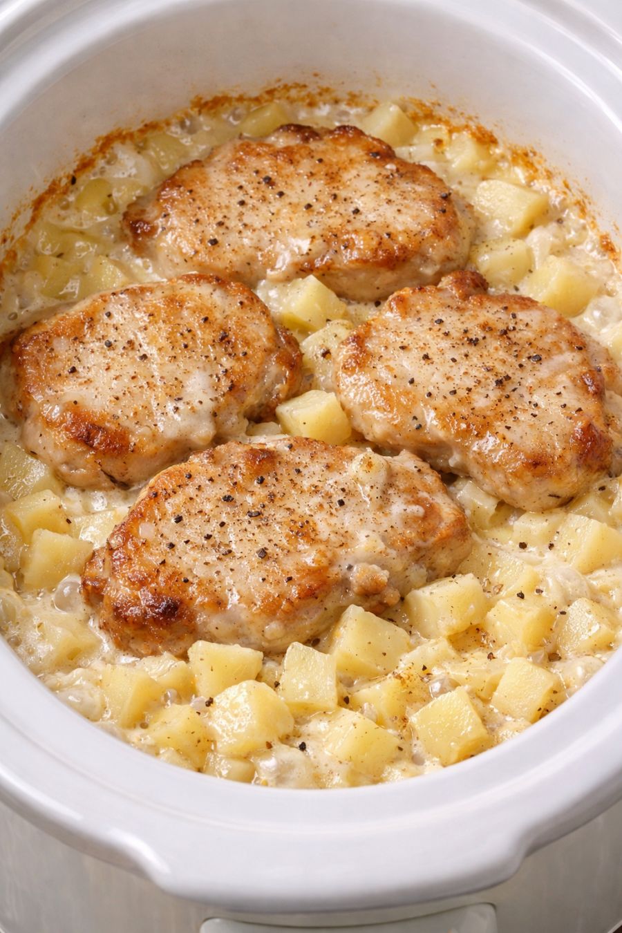 Cover the slow cooker with the lid and cook on LOW for 6 to 8 hours, or on HIGH for 3 to 4 hours, until the potatoes are very tender and the pork chops are cooked through and fork-tender. The sauce will be thick, creamy, and gently bubbling around the edges.