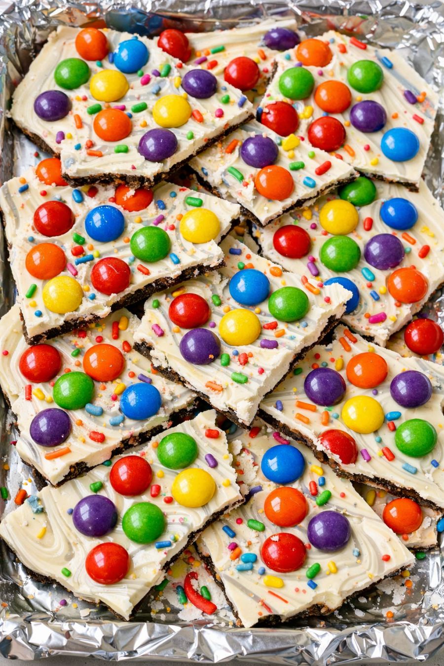 Scatter the rainbow sprinkles over the top, filling in any bare spots and creating that magical, confetti-style look. The mix of smooth candy pieces and tiny sprinkles is what gives the bark a fun, crackly crunch when you bite into it.