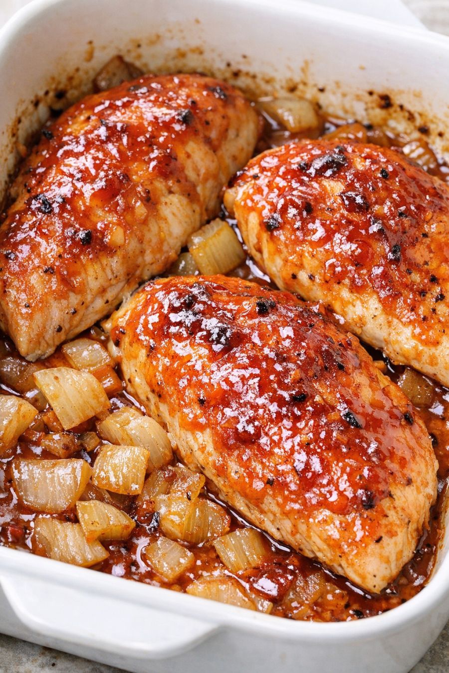 Remove the dish from the oven and let the chicken rest for 5 minutes. This allows the juices to settle and the sauce to thicken slightly. Spoon the vibrant glaze and softened onion pieces over the chicken before serving.