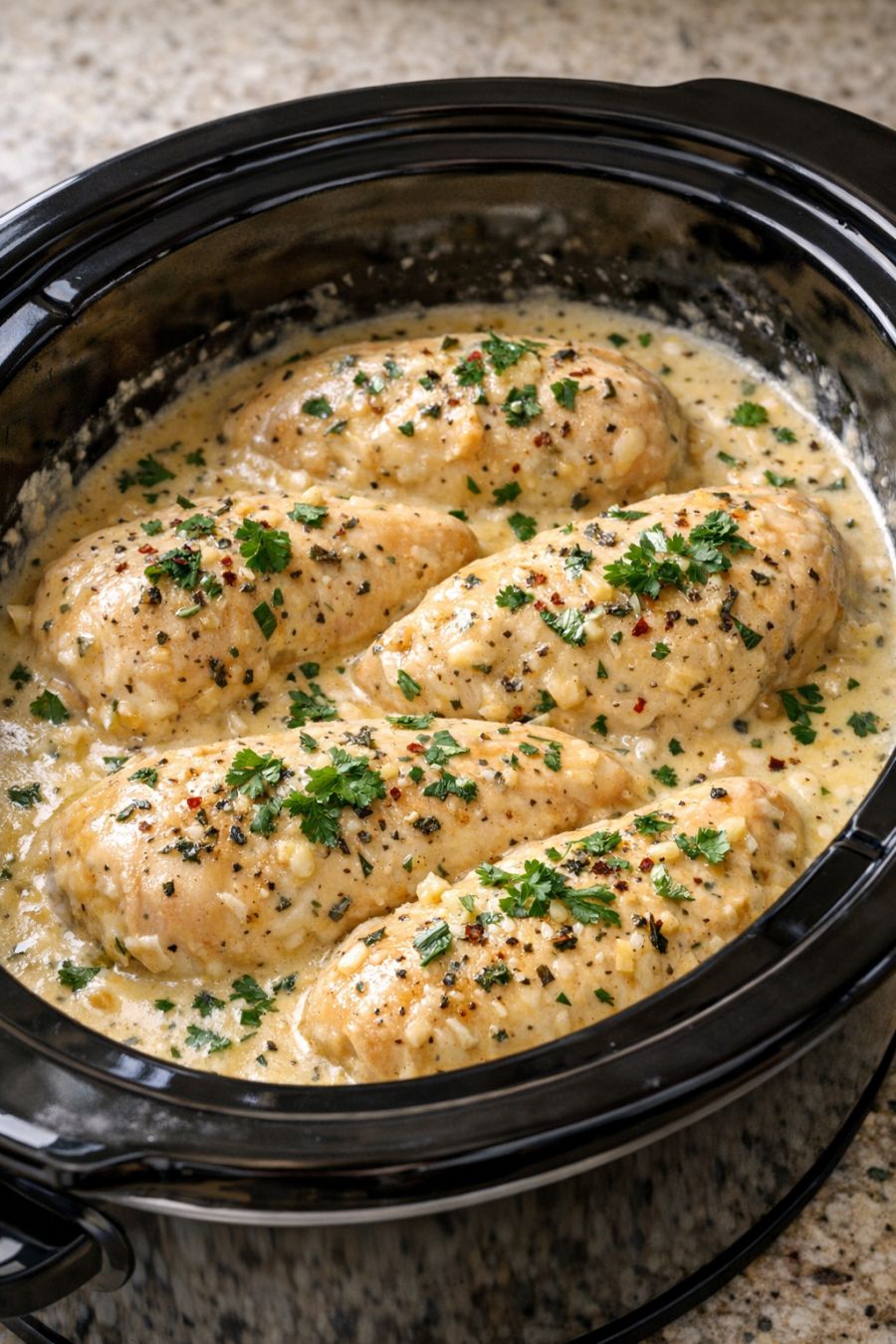Once the chicken is done, give the sauce a good stir right in the slow cooker, breaking up any remaining bits of cream cheese until the sauce is smooth, creamy, and herb-flecked. Taste and adjust seasoning if needed with a pinch of salt or pepper.