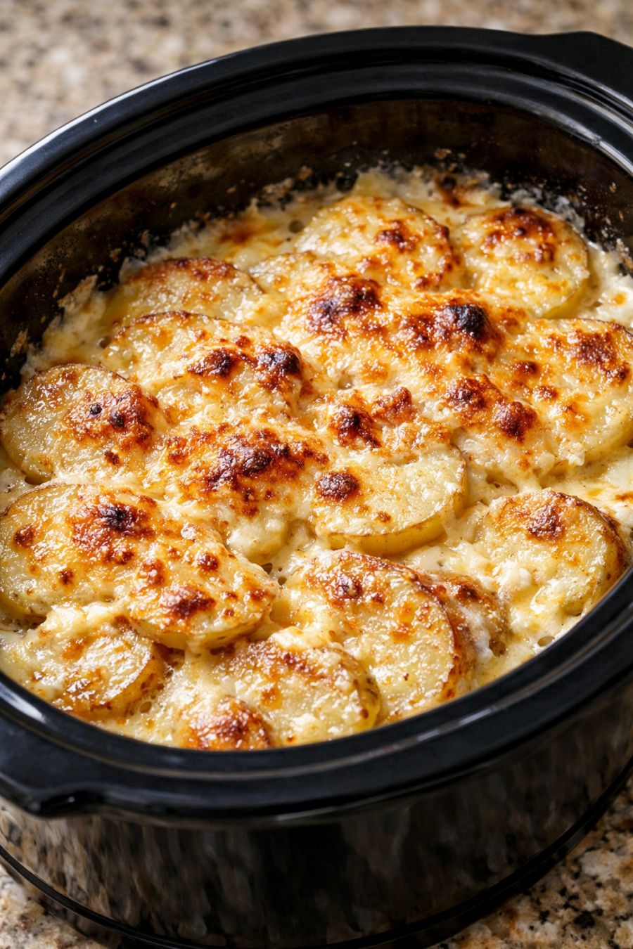 Turn off the slow cooker and let the potatoes rest, covered, for about 10 minutes. This short rest helps the creamy sauce thicken so each scoop holds together nicely.