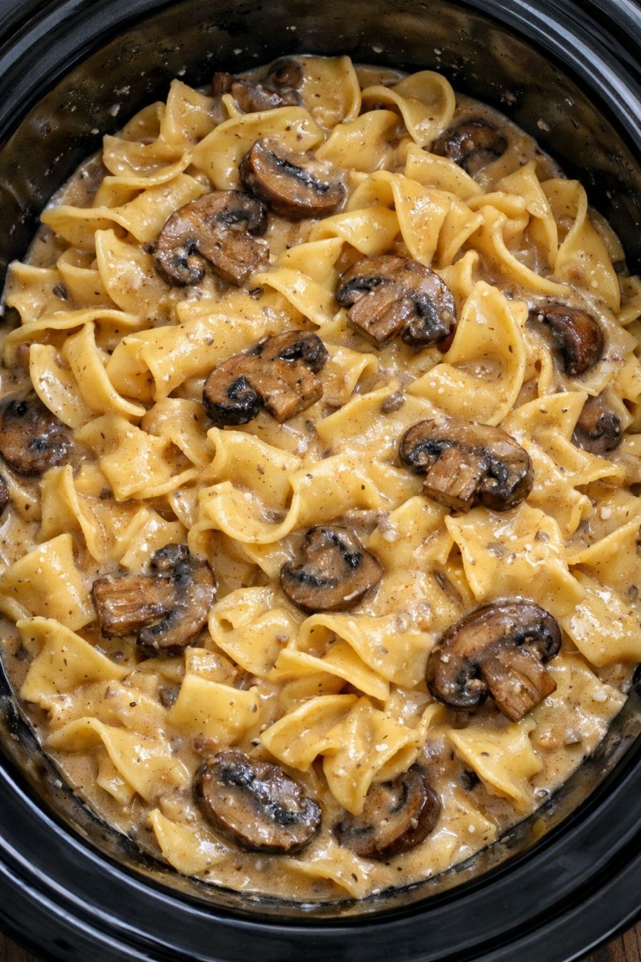 Serve the mushroom noodles hot, ladled straight from the slow cooker into bowls, making sure every serving gets plenty of the tender dark mushrooms and creamy tan sauce clinging to the golden egg noodles.