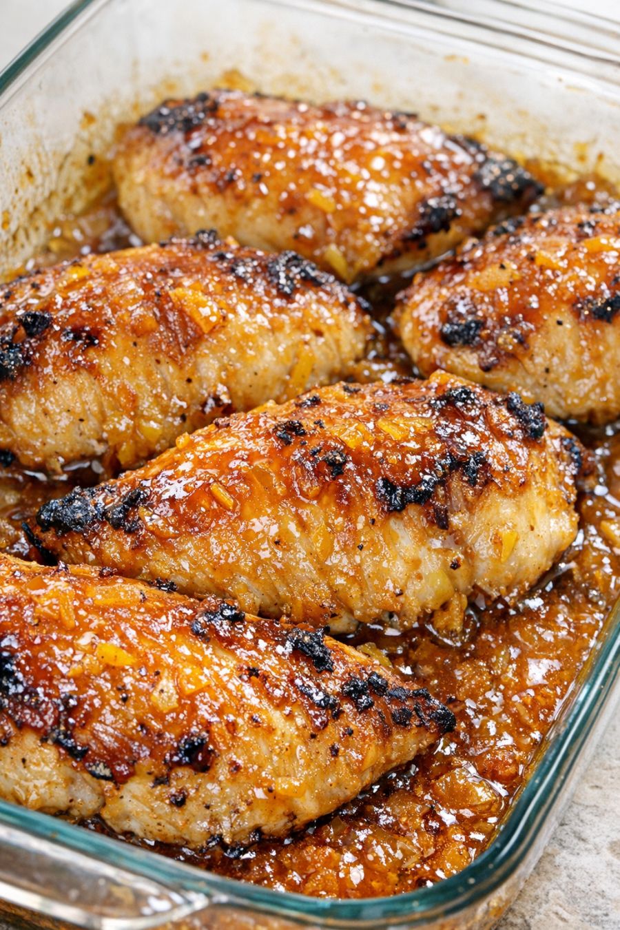 Trim any excess fat from the chicken breasts and pat them dry with paper towels. Arrange the chicken in a single layer in the prepared glass casserole dish, leaving a little space between each piece so the glaze can flow around them.