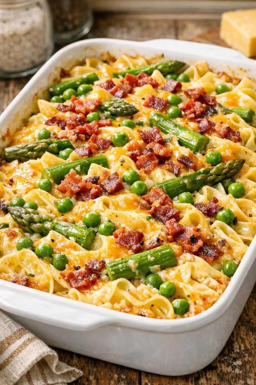 Serve this asparagus noodle bake hot, straight from the oven, with a simple green salad or some steamed green beans to keep things fresh and light on the side. Garlic bread, dinner rolls, or even buttered toast are great for scooping up the extra creamy sauce. If you want to round it out into a bigger meal, pair it with rotisserie chicken or baked pork chops. A crisp white wine or iced tea fits the cozy, casserole vibe perfectly.
