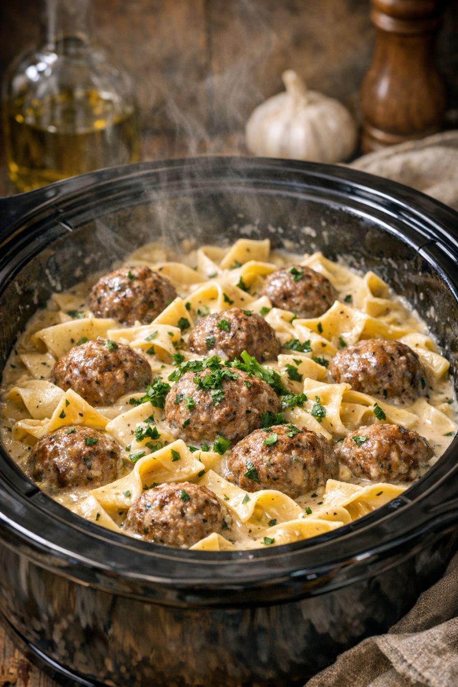 Finish and serve: Taste the cream sauce in the slow cooker and adjust the seasoning with a bit more salt and pepper if needed. To serve, place a bed of egg noodles on each plate and spoon the creamy beef meatballs and plenty of sauce over the top. Garnish with chopped fresh parsley for color and freshness, if you like, and serve immediately.