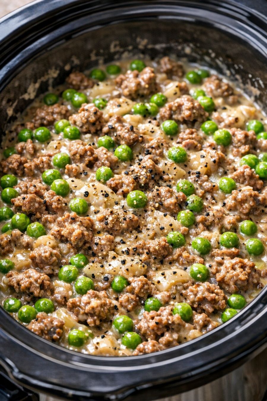 About 30 minutes before serving, remove the lid and gently stir everything together, breaking up any remaining clumps of beef and folding the peas and sauce together until it forms a creamy, hearty mixture. Taste and add a pinch of salt and black pepper if needed.