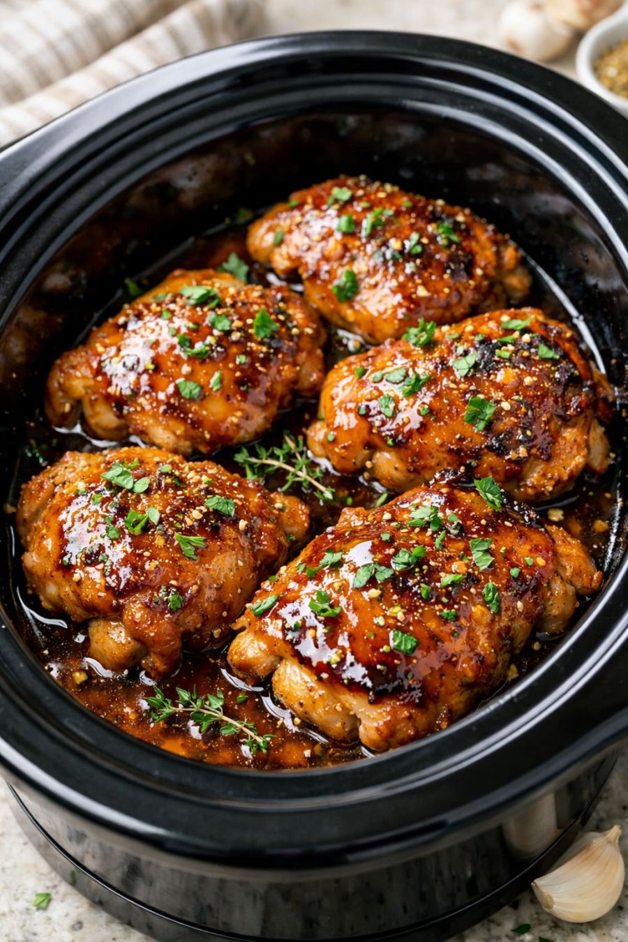 Optional but recommended for a golden, caramelized finish: Preheat your broiler and line a baking sheet with foil. Carefully transfer the cooked chicken thighs (skin side up) to the baking sheet, leaving the sauce in the slow cooker. Broil for 3 to 5 minutes, watching closely, until the skin is deep golden and lightly crisped.