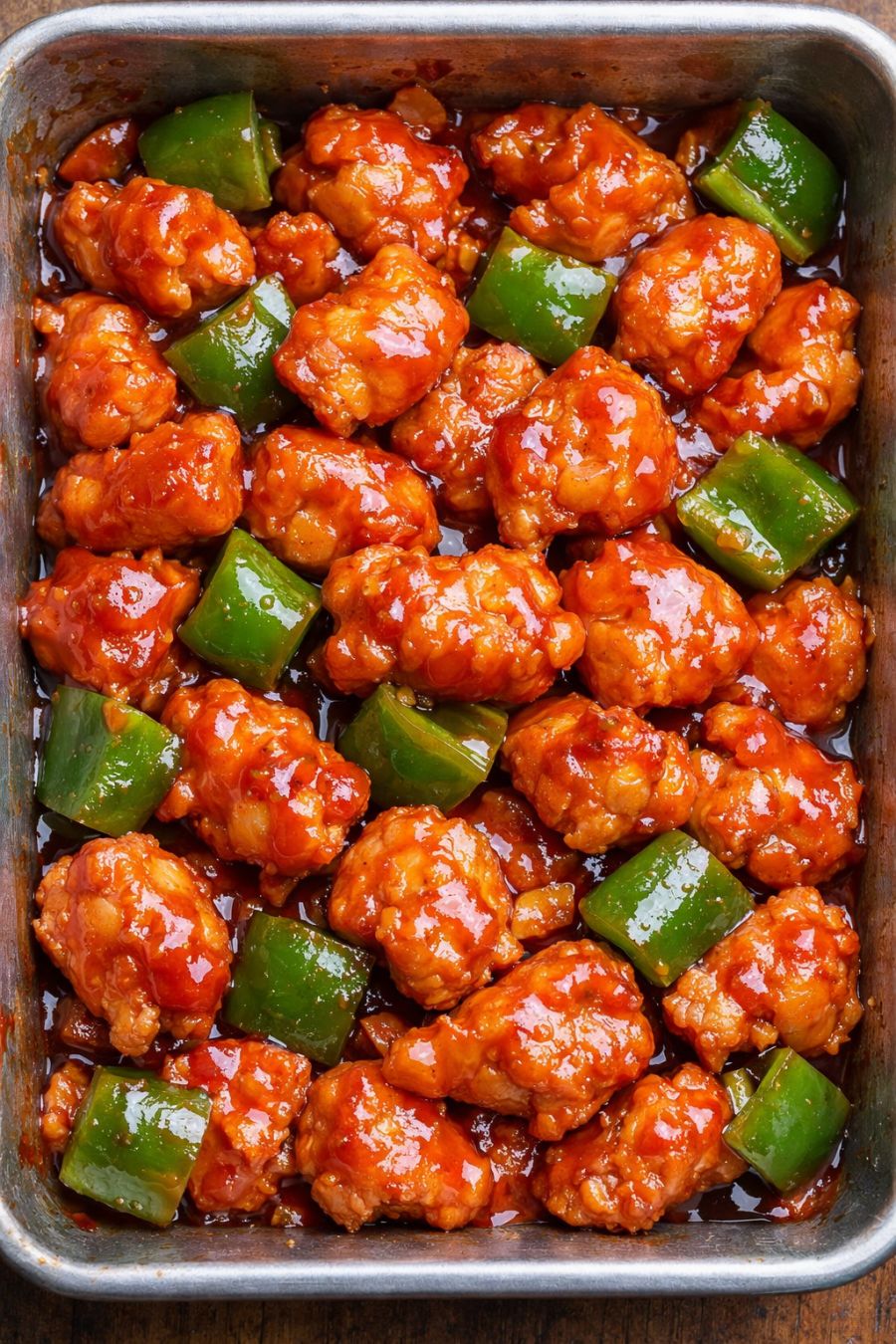 If you prefer a little more crunch, bake the frozen breaded chicken pieces by themselves for 10 minutes first, then add the peppers and sauce and finish baking until heated through. You can swap the green bell pepper for a bag of frozen stir-fry vegetables if that’s what you have, though the green pepper keeps it closest to that classic takeout look. For a sweeter, more old-fashioned Midwestern flavor, stir a small handful of drained pineapple tidbits into the pan along with the peppers (that would technically add a fourth ingredient, but it’s a nice touch for company). If all you have is plain cooked chicken chunks or rotisserie chicken, you can use that too—just know the texture will be softer without the breading, so shorten the baking time to about 15–20 minutes. To stretch the meal for a larger family, add an extra bell pepper and a bit more sauce, then serve over plenty of rice. Leftovers reheat well in the oven, covered with foil, or in a skillet with a splash of water to loosen the sauce.