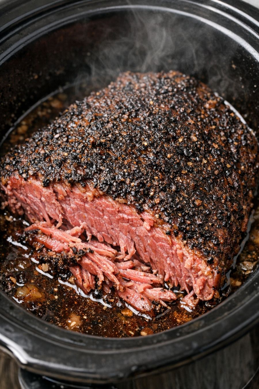 Cover the slow cooker with the lid and cook on LOW for 8 to 10 hours, or on HIGH for 4 to 5 hours, until the corned beef is very tender and easily pulls apart with a fork. The surface will look dark from the coffee rub, and the meat will be a pinkish red inside with a shallow pool of dark, savory juices around it.