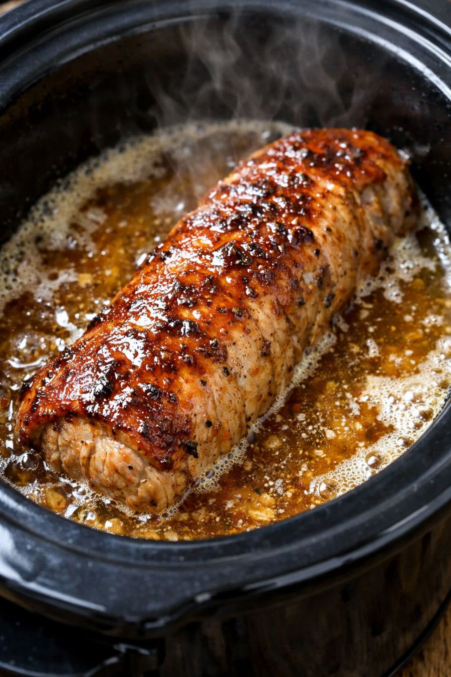 Once done, carefully lift the tenderloins onto a cutting board and let them rest for about 5 minutes. Meanwhile, skim off any excess fat from the surface of the cooking liquid in the slow cooker, if needed.
