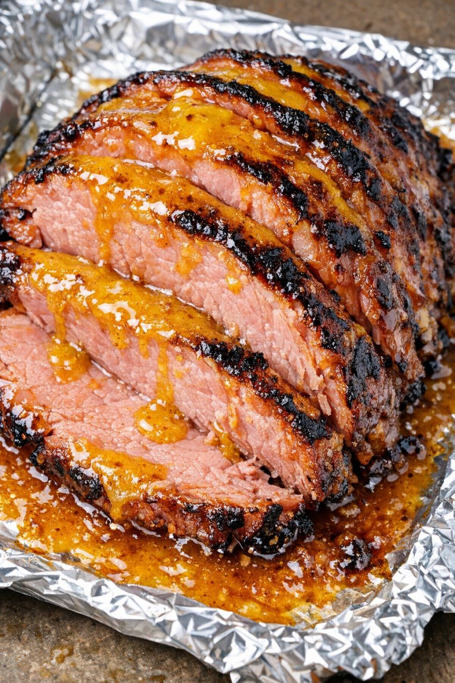 Remove the ham from the oven and let it rest for 10–15 minutes so the juices settle. Slice the ham into thick pieces right on the foil-lined pan, spooning the sticky yellow glaze and syrupy juices over the slices before transferring them to a serving platter. Serve warm, with extra glaze from the pan on the side.