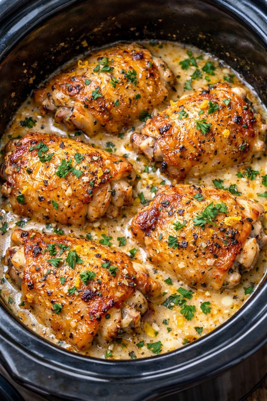 Serve the chicken thighs hot, spooning the golden herbed butter sauce from the slow cooker over the top and around the sides so it pools on the plate for dipping bread or draping over potatoes.