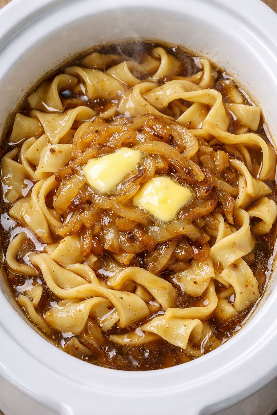 Let the noodles sit on WARM for about 5 to 10 minutes to thicken slightly. Give a final gentle stir, making sure the soft golden onion slices are distributed throughout, then serve the noodles straight from the slow cooker while steaming hot.