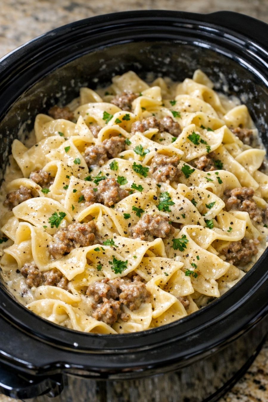 When the noodles are tender and coated in the creamy sausage gravy, turn the slow cooker to WARM. Let the dish rest for 5 to 10 minutes with the lid on; this helps the sauce thicken and cling to the noodles.