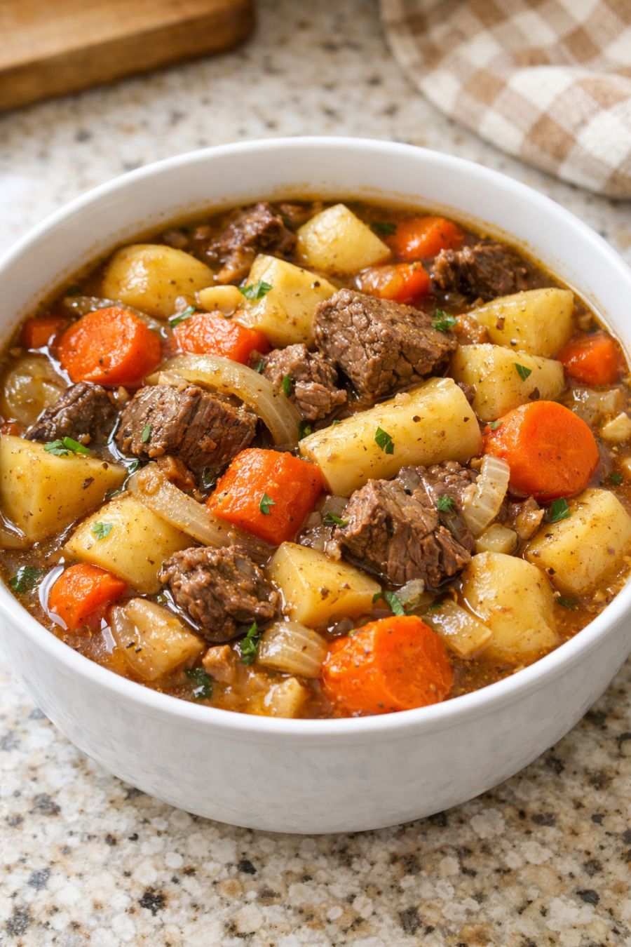 To keep the spirit of a simple Amish-style stew, I like to stick close to the base recipe, but there’s still room to personalize it. For extra vegetables, add 2 diced carrots or 2 ribs of chopped celery on top of the onions before pouring in the broth. If you prefer a thicker stew, whisk 2 tablespoons of flour or cornstarch into 1/4 cup of cold beef broth, then stir it into the slow cooker during the last 30 minutes of cooking and let it bubble on HIGH. To lean a little lighter, you can use 90% lean stew meat or trim off any large pieces of fat before adding the beef. For a slightly different but still cozy flavor, swap half the beef broth for chicken broth and add 1 teaspoon of dried thyme or rosemary to the broth mixture. If you’re cooking for very young kids or spice-sensitive eaters, reduce the black pepper to 1/2 teaspoon and let adults add more at the table. This stew also reheats beautifully, so consider doubling the recipe if your slow cooker is large enough—future you will be thrilled to pull a container of it from the freezer on a hectic weeknight.