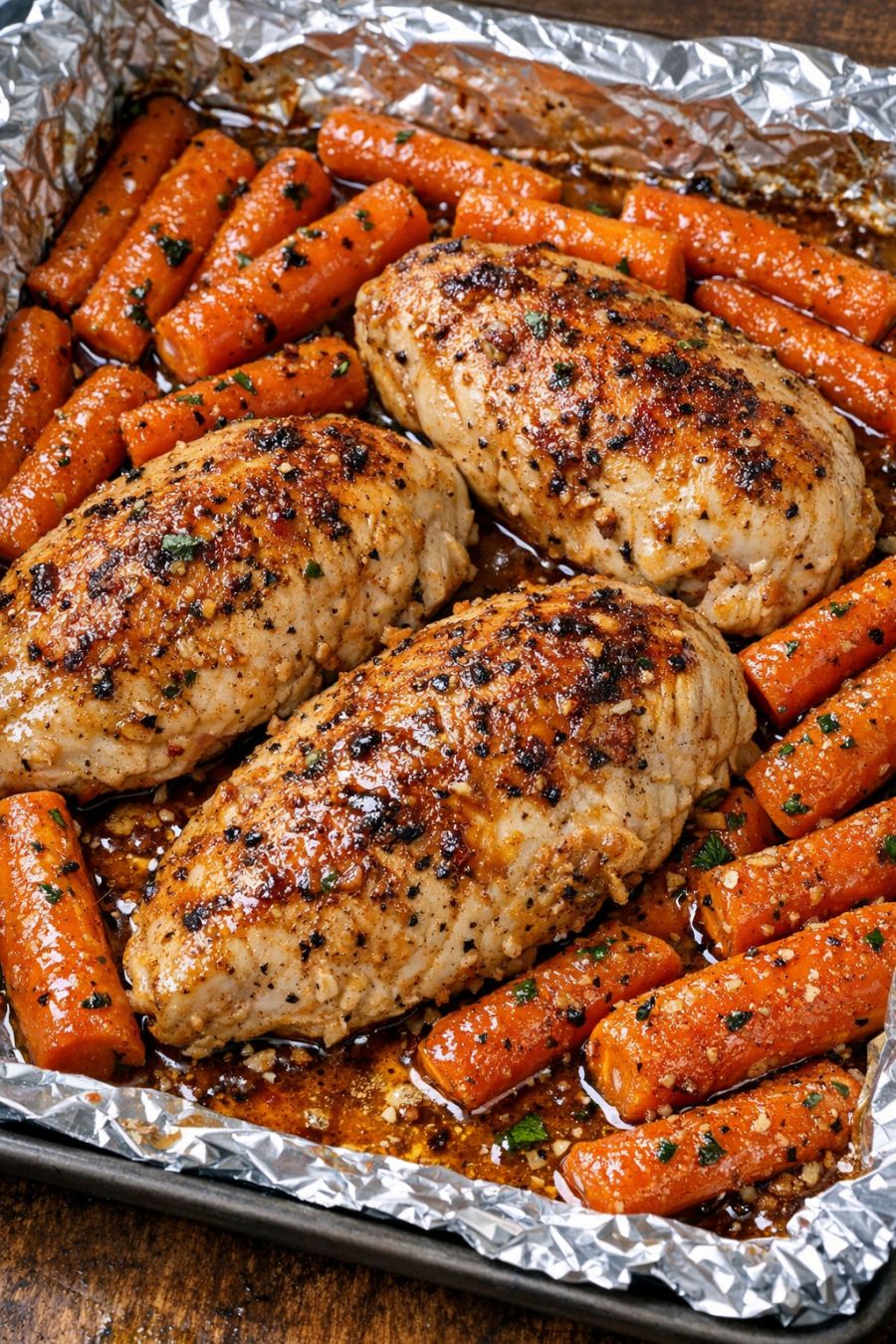 Continue baking, uncovered, for another 20–25 minutes, basting once more halfway through, until the chicken is cooked through (internal temperature 165°F/74°C) and the carrots are tender and glazed. The honey-butter should deepen in color and form rich pan drippings around the carrots.