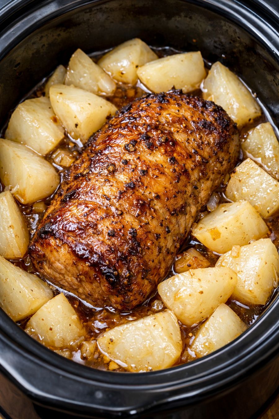 Place the seasoned pork loin on top of the turnips in the center of the slow cooker. The meat should be sitting above most of the liquid so the top can roast gently and take on that golden-brown color while the bottom bastes in the juices.