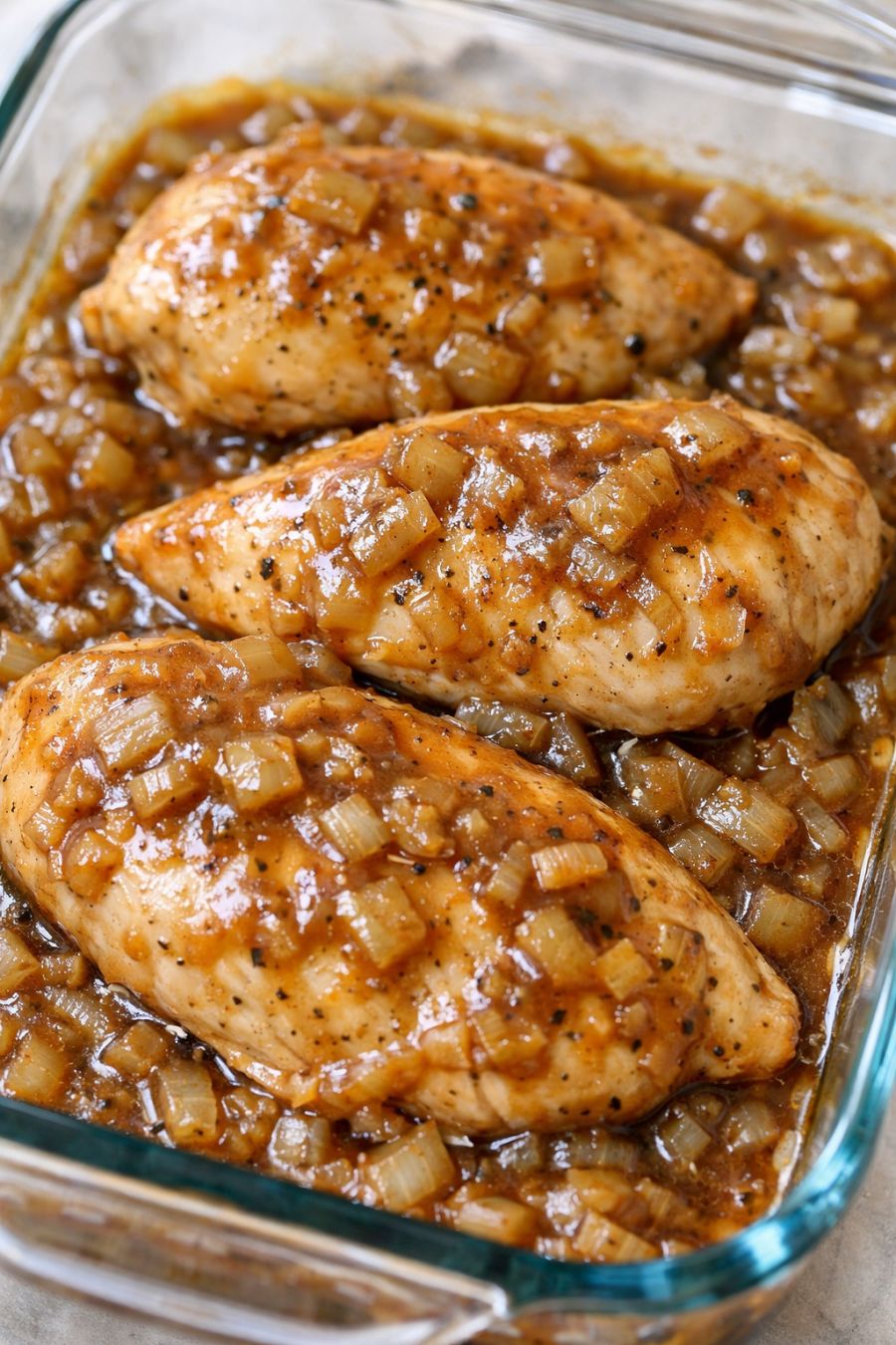 To serve, slice or leave the chicken breasts whole and spoon plenty of the onion gravy and caramelized onion bits over the top. Serve directly from the glass casserole dish for that cozy, family-style presentation.