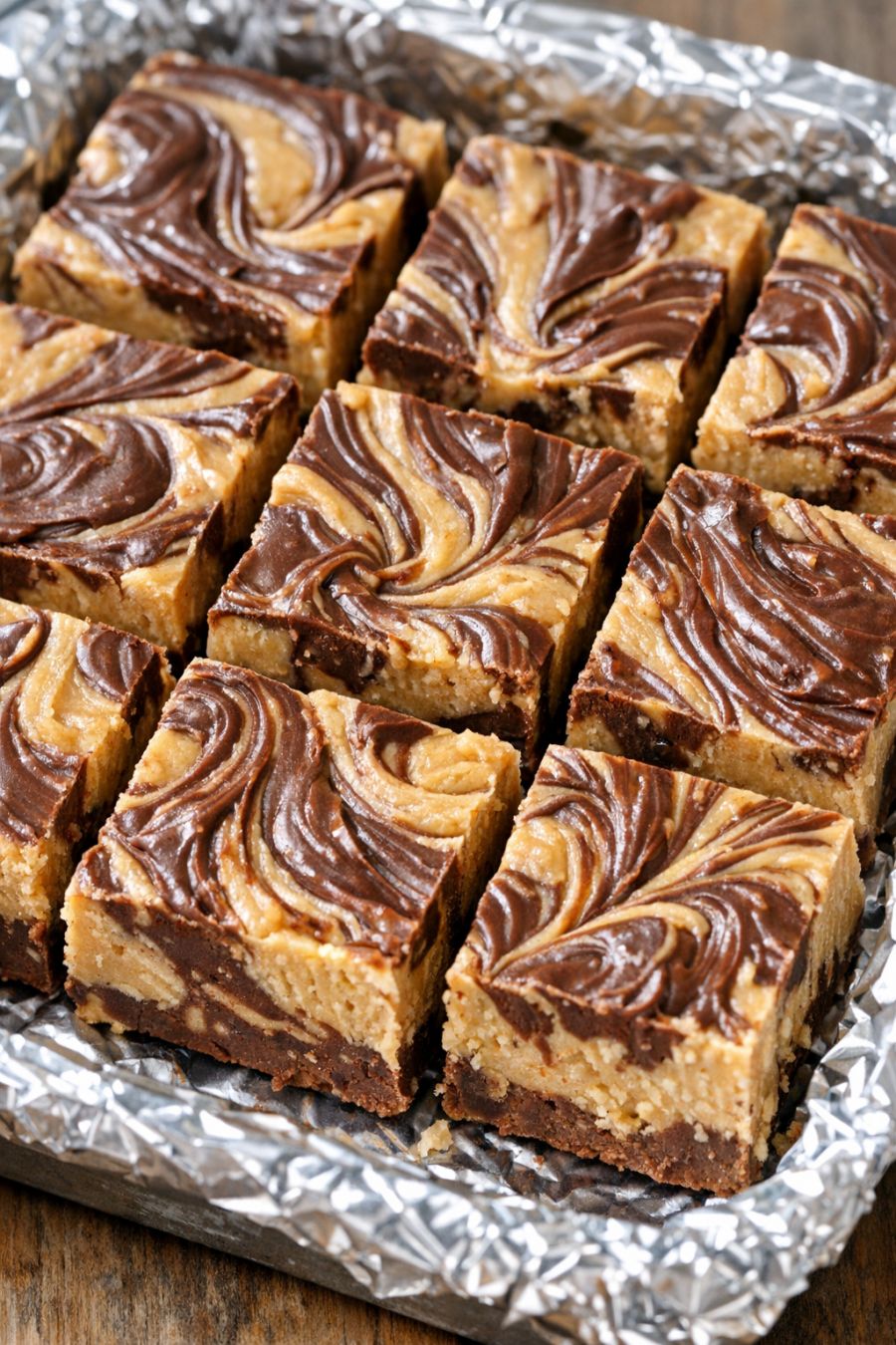 Quickly pour the hot fudge mixture into the foil-lined pan, using a spatula to scrape every bit from the slow cooker. Smooth the top so it’s even. If you reserved peanut butter for swirls, dollop it over the top and drag a butter knife through in short, gentle strokes to create a marbled effect.