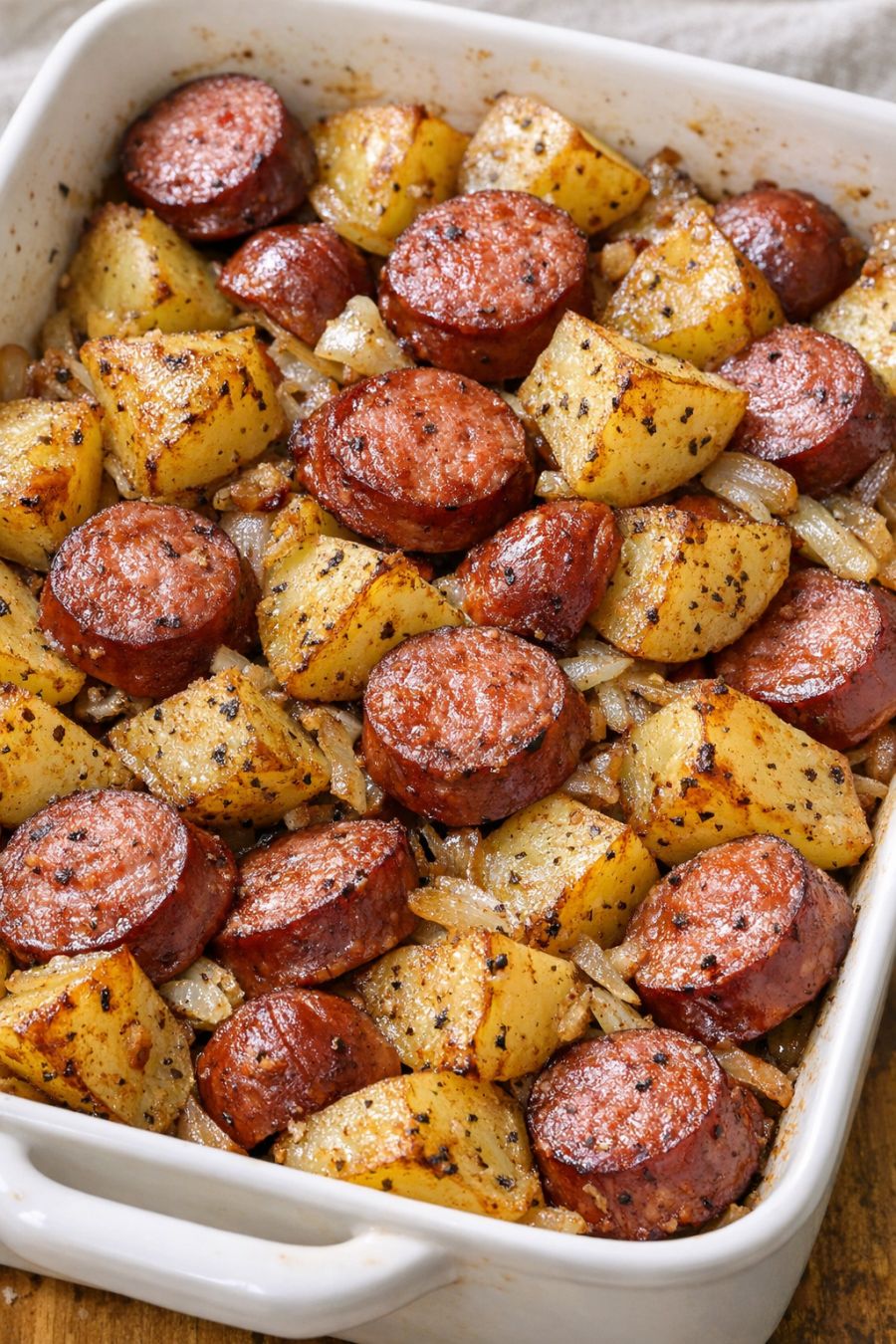 This oven baked 3-ingredient sausage and potato bake is the kind of unfussy Sunday supper my aunt swears by—and she’s right, it disappears fast. It leans on three workhorse ingredients: smoked sausage for deep, savory flavor, russet potatoes that roast up fluffy inside and crisp at the edges, and a good bottled Italian dressing that does triple duty as oil, seasoning, and tangy marinade. This is very much a Midwestern-style, church-basement casserole in spirit: practical, budget-friendly, and reliable enough to put on repeat when you want real comfort with minimal prep and almost no cleanup.