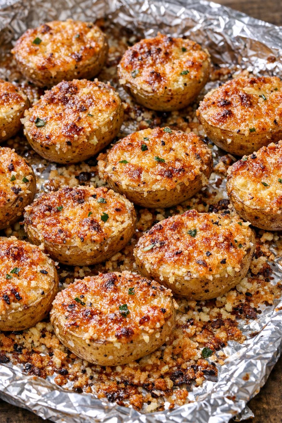 Using a thin spatula, gently loosen the potatoes from the foil, scooping up that crispy Parmesan layer with them. Transfer to a serving platter, making sure each potato half gets some of the golden cheese crust. Serve warm and enjoy while the edges are still crunchy.