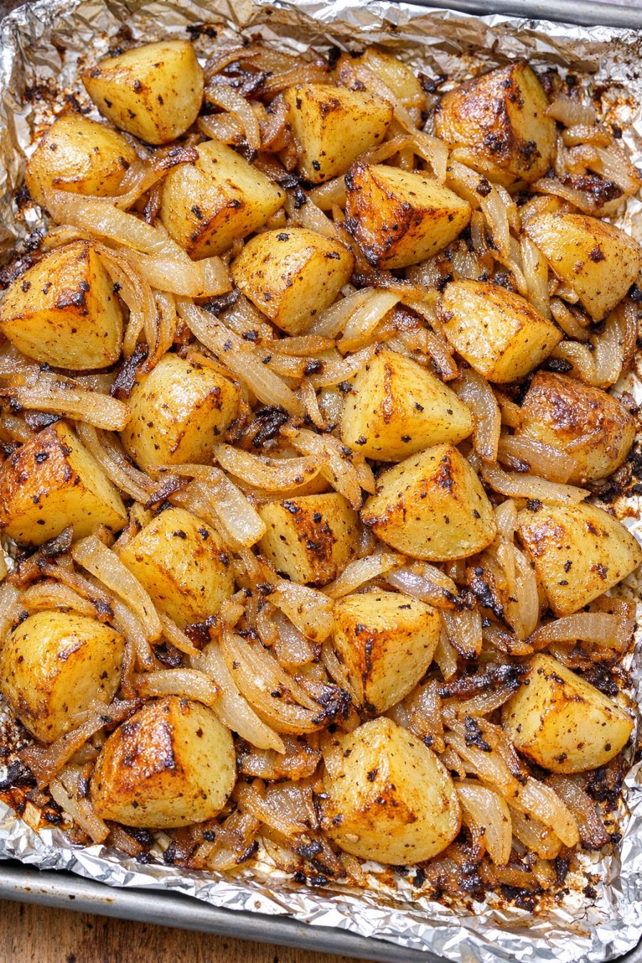 Carefully remove the top layer of foil (watch for steam) and gently stir the potatoes and onions to bring some of the softer pieces up from the bottom. Spread them back out into an even layer.