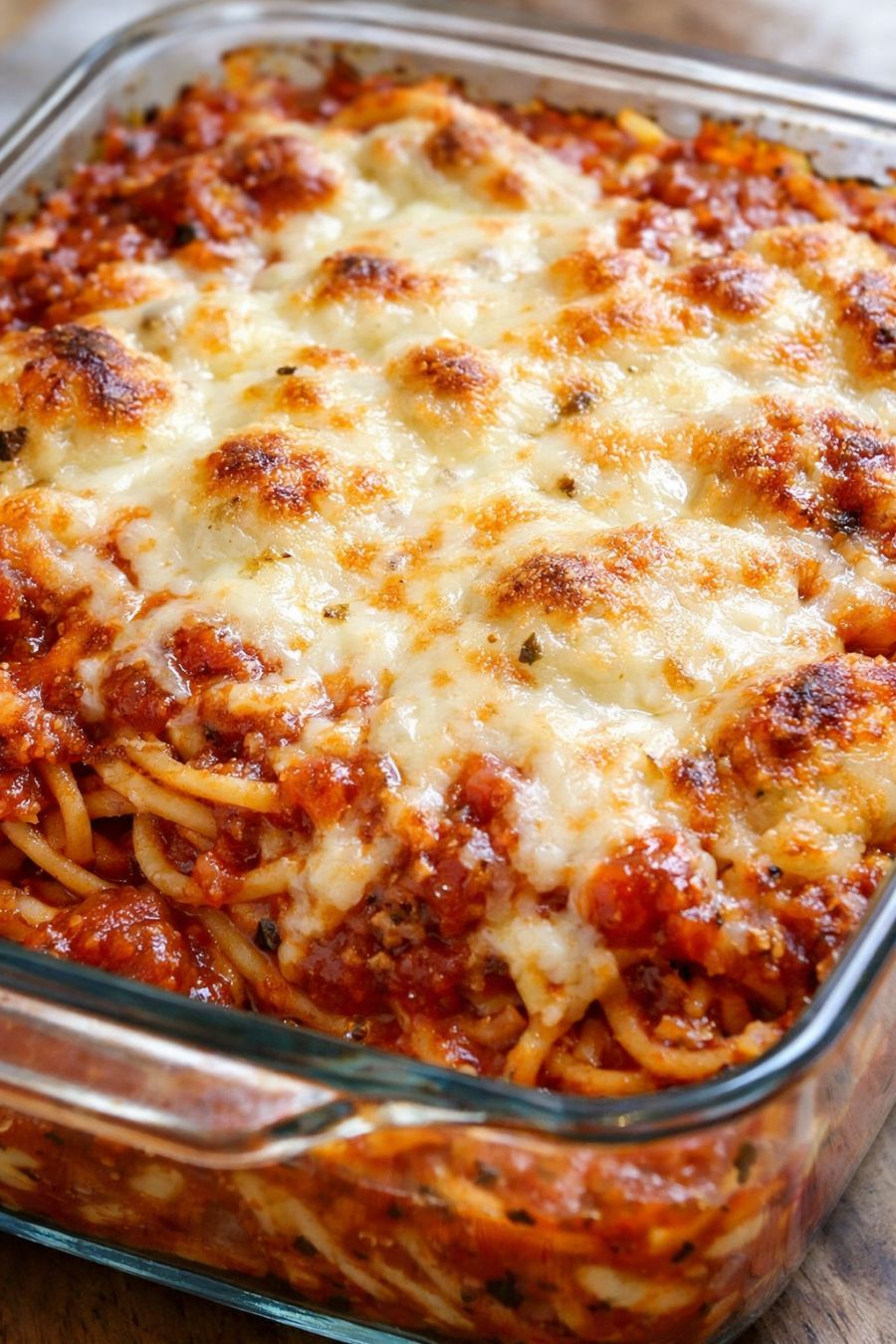 For picky eaters, stick with a very smooth, mild marinara sauce so there are no visible chunks of tomato or herbs to fuss over. If your family likes a little more flavor but you still want to keep it simple, use a garlic- or basil-forward jarred sauce. You can also switch up the shape of the pasta: use penne or rotini instead of spaghetti if that’s what you have on hand, just keep the amount the same. To stretch the casserole for a bigger crowd, serve it with extra sauce warmed on the side so each person can spoon more over their portion. If you’re making this ahead, assemble the casserole, cover tightly, and refrigerate up to 24 hours; when baking from cold, add about 10 extra minutes covered before uncovering to brown the cheese. For a slightly crispier top, move the dish under the broiler for 1–2 minutes at the very end, watching closely so the mozzarella bubbles and browns without burning. Leftovers reheat well in the oven, covered with foil, or in the microwave with a splash of extra sauce to keep everything moist.