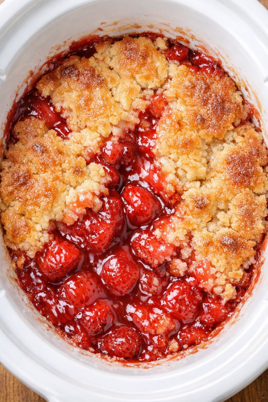 Once cooked, turn off the slow cooker and let the cobbler sit, covered, for about 10 to 15 minutes to thicken slightly. The top should look like a buttery, golden brown crust with glossy red strawberry filling peeking through.