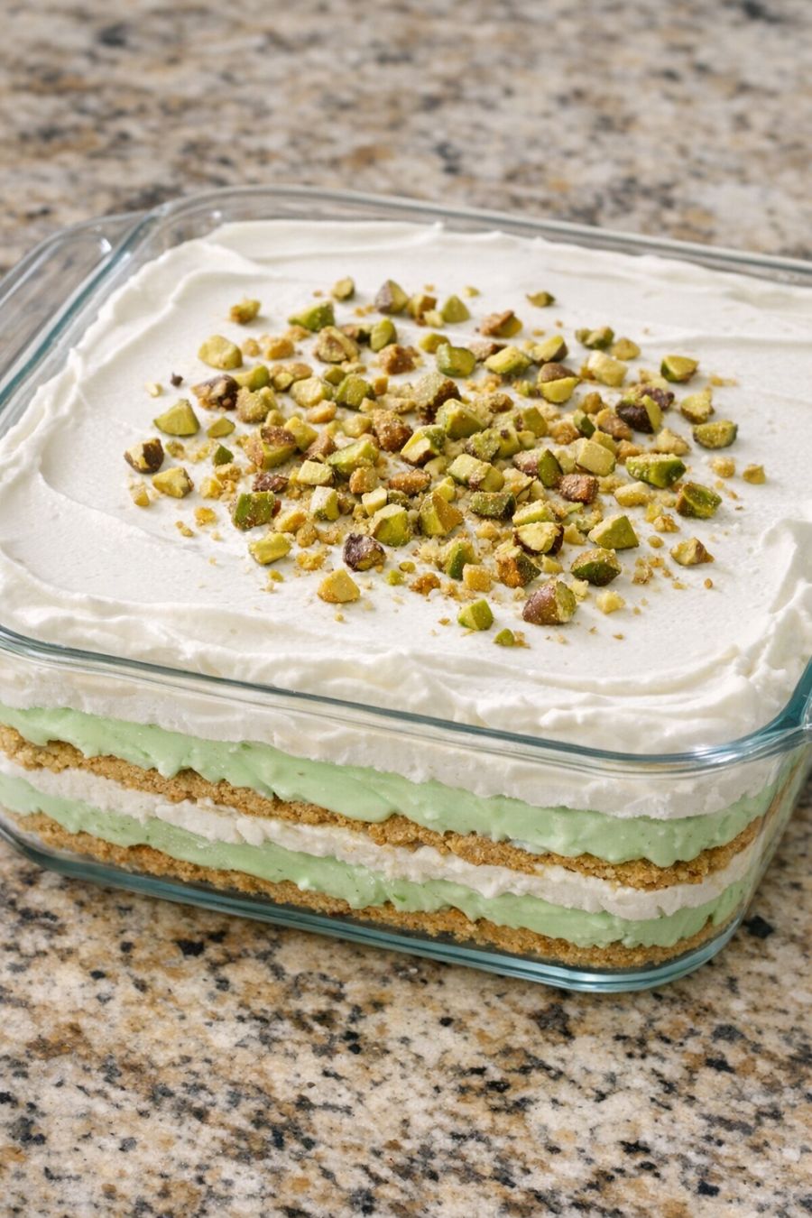If your family loves nuts, you can sprinkle a handful of chopped pistachios over the top whipped layer before chilling for extra crunch and color. For a slightly lighter version, use sugar-free instant pistachio pudding and light whipped topping; just know the texture may be a bit softer. If you like things a little less sweet, swap some of the graham crackers with plain tea biscuits. To make it look extra pretty for holidays, reserve a spoonful of the pistachio cream and dollop or swirl it into the top whipped layer for a pale green marbled effect. You can also divide the recipe into two 8x8-inch pans instead of one 9x13—this is what I do when I know the first pan will disappear instantly, just like it did at Nana Margaret’s house.