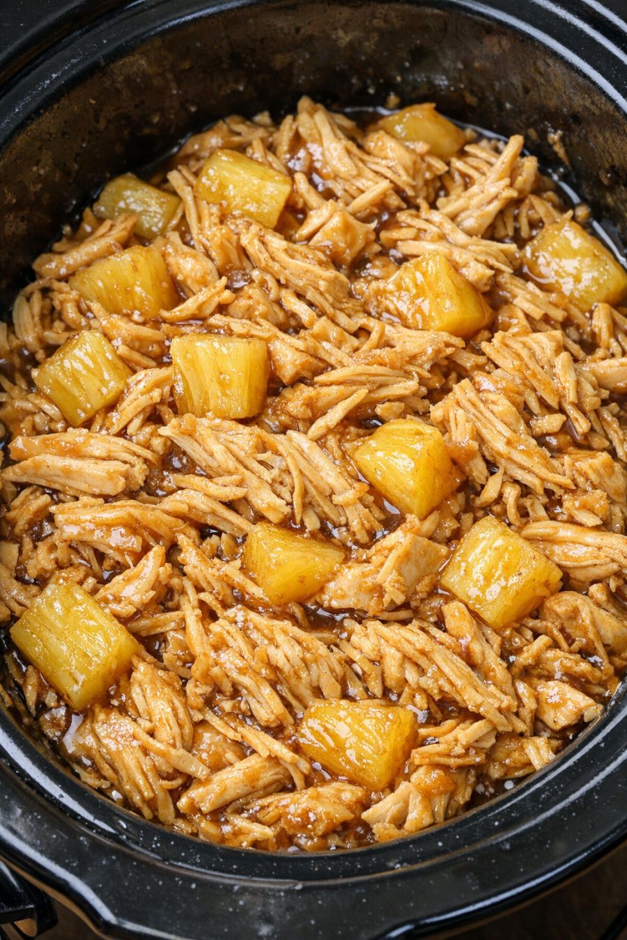 Once the chicken is cooked, use two forks to gently shred it directly in the slow cooker. Stir the shredded chicken into the pineapple-brown sugar juices until everything is well coated in the glossy glaze.