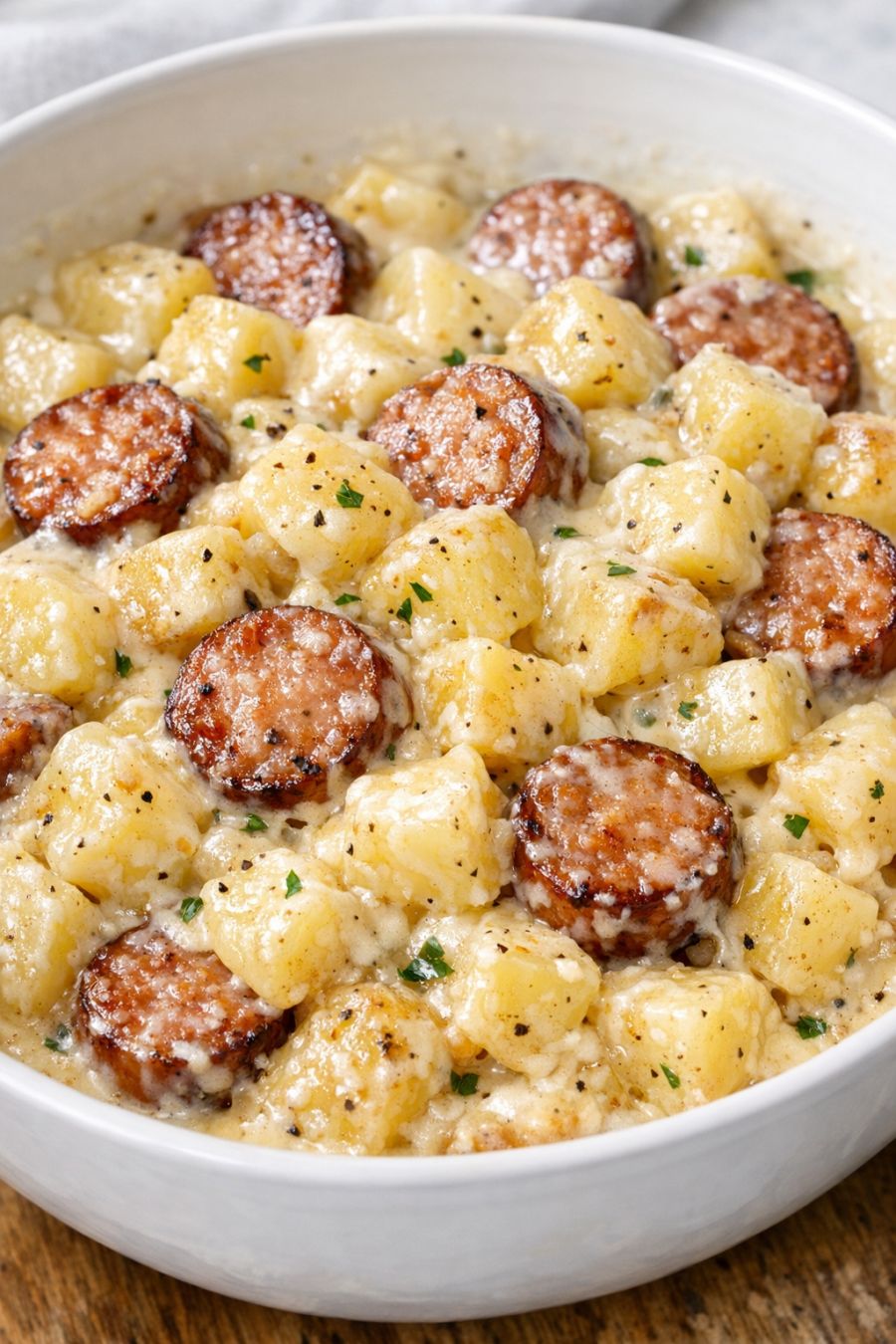 Turn off the heat and let the skillet sit for 5 minutes before serving. The sauce will thicken a bit more as it rests. Serve hot, spooned into wide bowls so everyone gets plenty of potatoes, sausage, and that creamy, rib-coating sauce.
