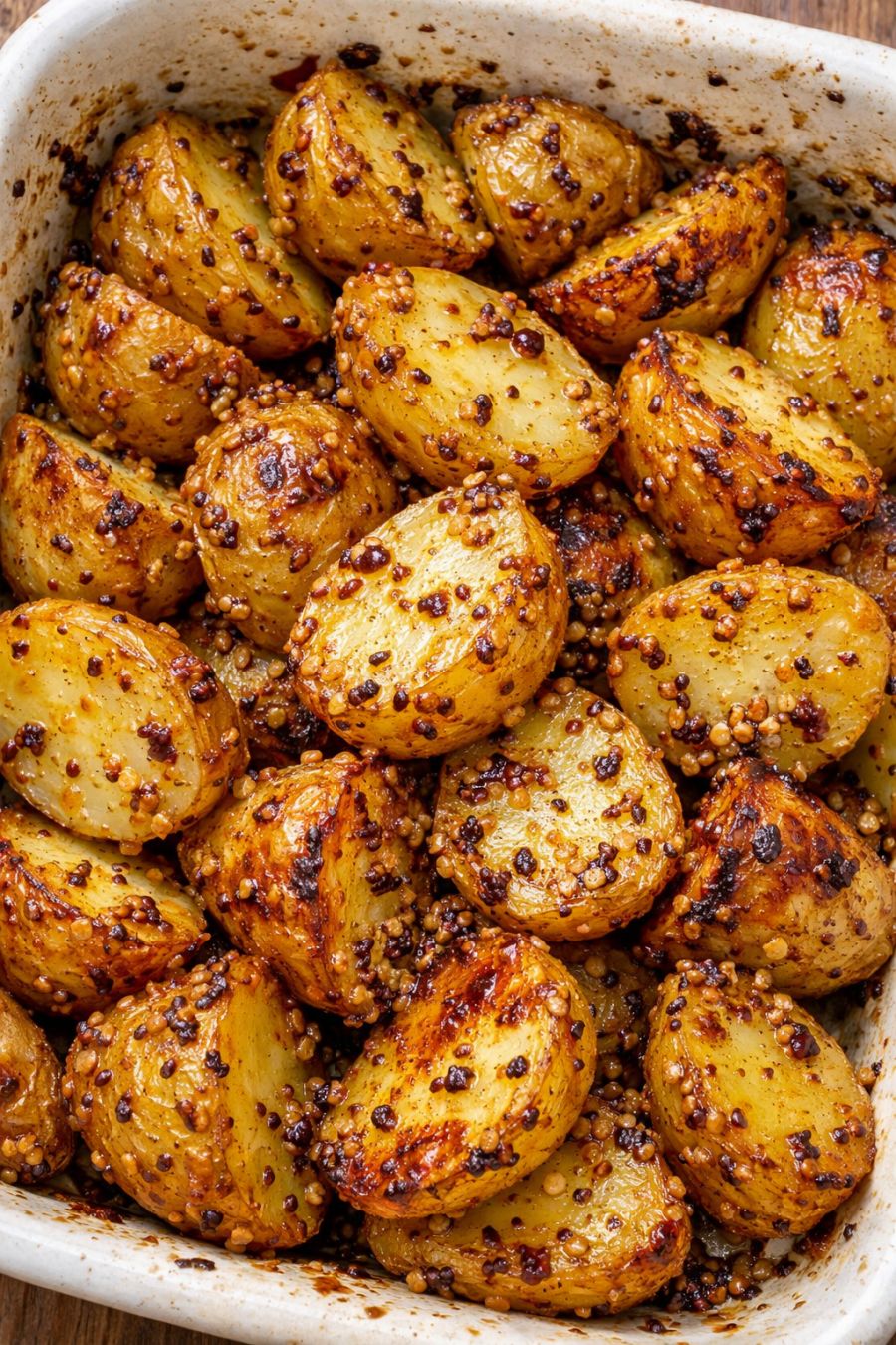 Taste a potato and add a pinch more salt if needed. Serve the potatoes hot, right in the ceramic baking dish, with all the rustic mustard seeds clinging to the crispy, golden edges.