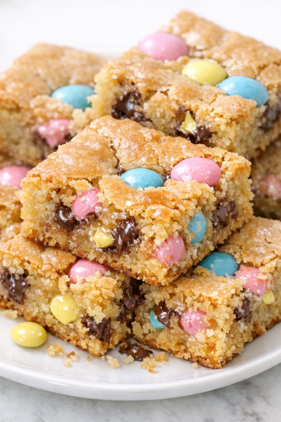 Serve these blondies slightly warm so the pastel candies are just a little melty and the centers stay chewy. I like to cut them into small squares and pile them on a white plate or platter so the colors really pop. They’re wonderful with a glass of cold milk for the kids, or a cup of coffee or hot tea for the grown-ups. For a special spring dessert, add a scoop of vanilla ice cream or a dollop of whipped cream on top of each square and drizzle with a little caramel sauce if you’re feeling extra indulgent.