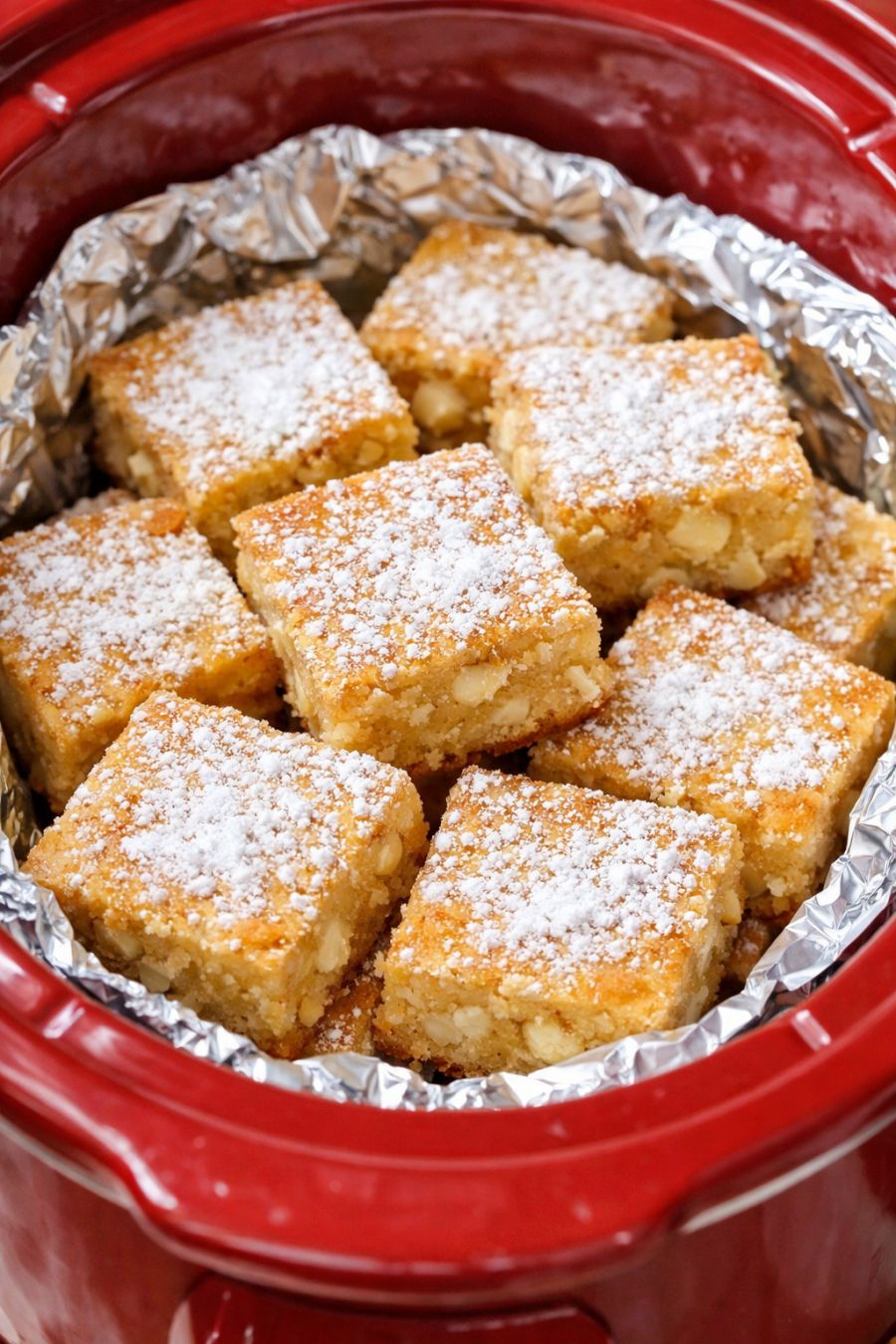 Serve these warm, straight from their foil packets, dusted with powdered sugar right before they hit the table. A scoop of vanilla ice cream or a dollop of whipped cream turns them into an old-fashioned supper-club style dessert. They go nicely with coffee after Sunday dinner, or with cold milk for the grandkids at the kitchen table. If you’re hosting a little gathering, keep the blondies in the slow cooker on warm and let guests open their own foil packets—set out small plates, forks, and maybe a bowl of fresh berries to cut the sweetness just a bit.