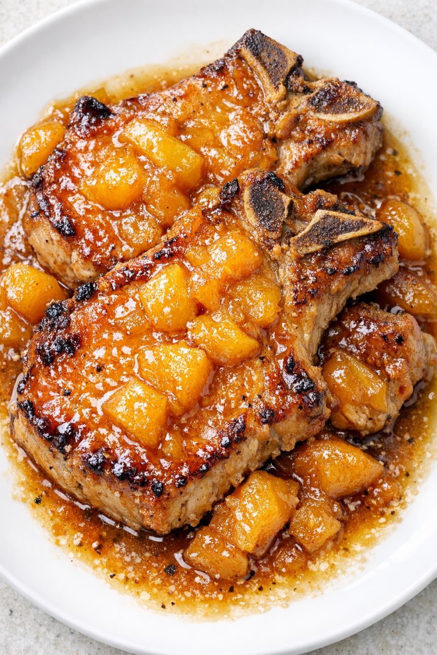 Spoon the hot, sticky peach glaze and plenty of peach chunks over the pork chops, letting the caramelized juices pool around the meat on the plate. Serve warm while the glaze is still glossy and bubbling at the edges.
