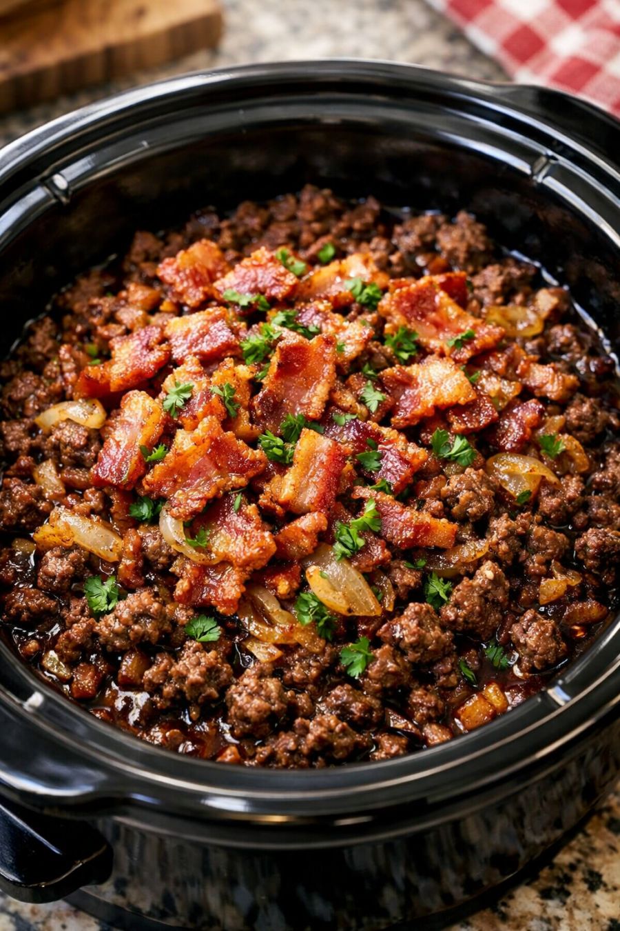 Cover the slow cooker with the lid. Cook on LOW for 6–7 hours or on HIGH for 3–4 hours, until the ground beef is fully cooked through, the bacon is tender and browned around the edges, and the onions are soft. If your slow cooker tends to run hot, start checking on the shorter end of the time range.